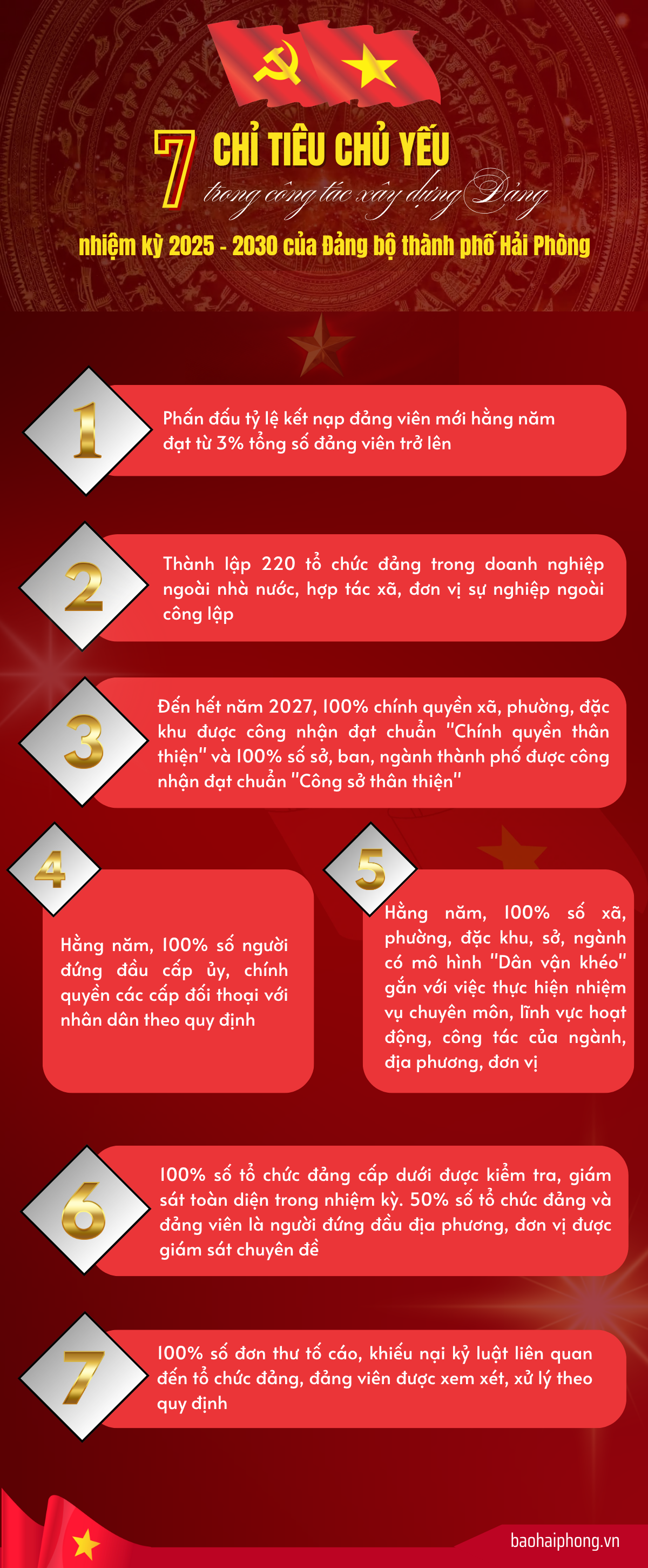 7 chỉ tiêu chủ yếu trong công tác xây dựng Đảng nhiệm kỳ 2025 - 2030 của Đảng bộ thành phố Hải Phòng