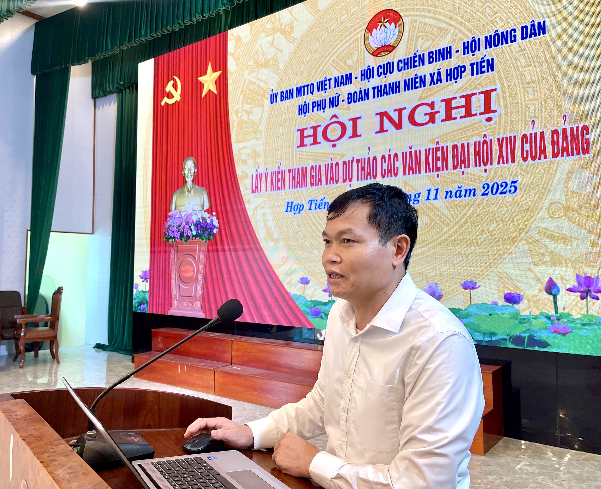 Thực hiện Hướng dẫn của cấp trên về việc tổ chức lấy ý kiến tham gia vào Dự thảo các Văn kiện trình Đại hội đại biểu toàn quốc lần thứ XIV của Đảng, ngày 12/11 Ủy ban Mặt trận Tổ quốc Việt Nam xã Hợp Tiến, Hội Cựu chiến binh, Hội Nông dân, Hội Phụ nữ và Đoàn Thanh niên xã đã tổ chức Hội nghị lấy ý kiến đóng góp vào Dự thảo các Văn kiện Đại hội XIV của Đảng.