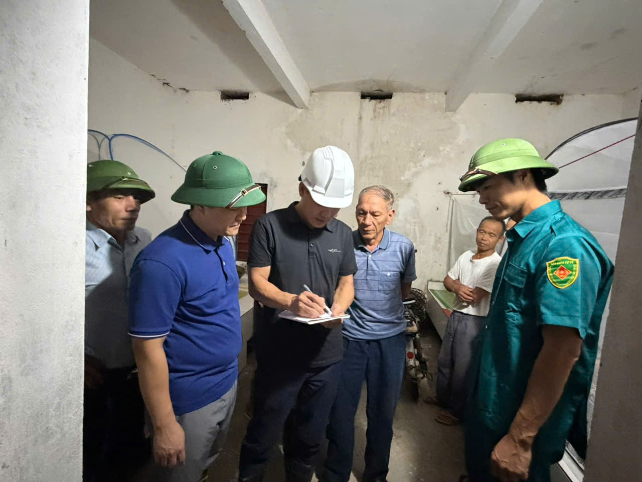 Lãnh đạo Đảng ủy, UBND xã Hợp Tiến cùng đại diện Ban Chỉ huy phòng thủ dân sự và Phòng Kinh tế xã đã trực tiếp kiểm tra thực địa tại các điếm canh đê, các đoạn đê xung yếu và khu vực có nguy cơ sạt lở cao dọc tuyến đê giáp sông Kinh Thầy.