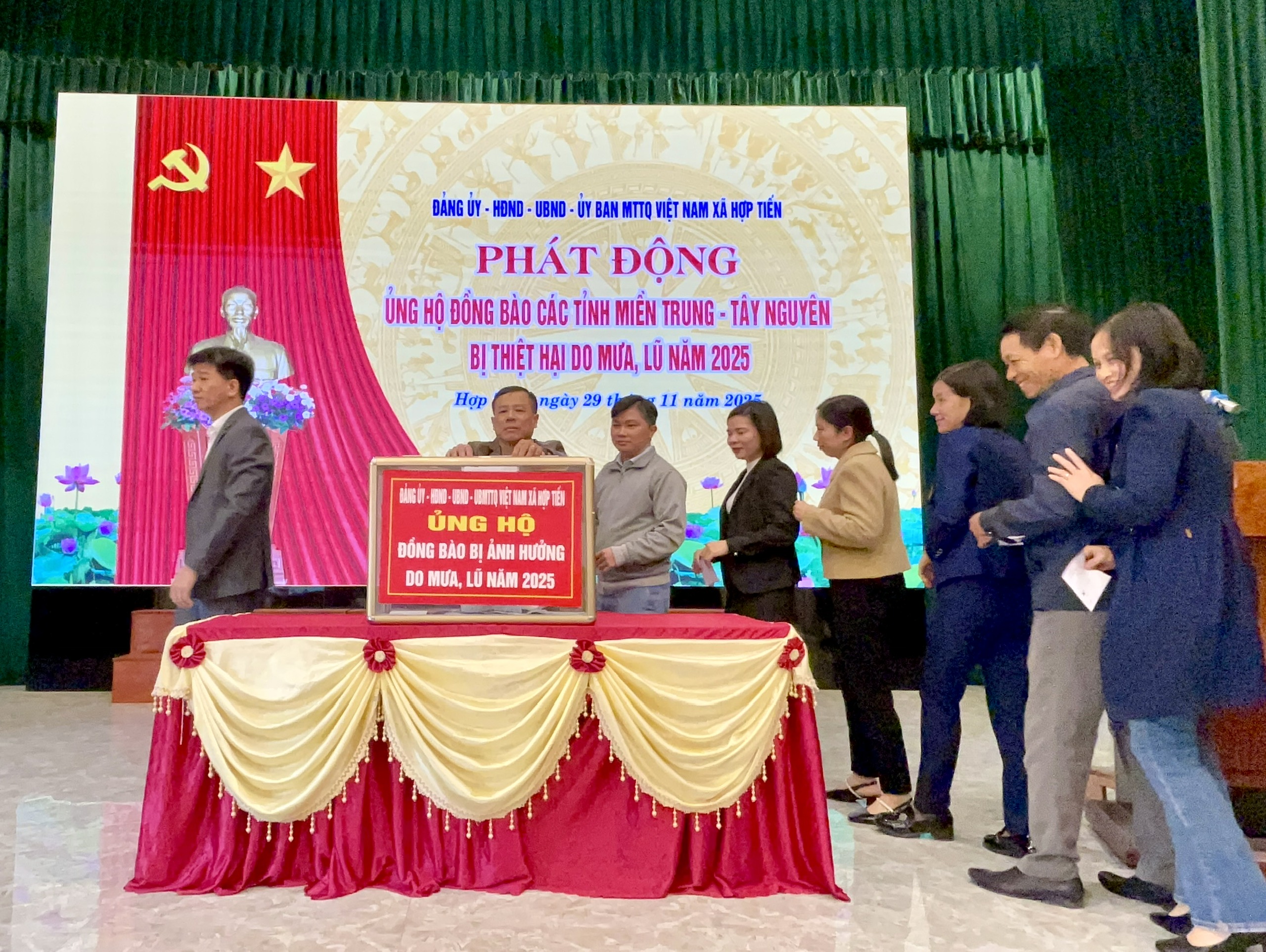 Đảng ủy – HĐND – UBND – Ủy ban MTTQ Việt Nam xã Hợp Tiến ủng hộ đồng bào các tỉnh miền Trung và Tây Nguyên khắc phục hậu quả mưa lũ năm 2025Tại lễ phát động, lãnh đạo xã kêu gọi mỗi cán bộ, đảng viên, công chức, viên chức và Nhân dân tích cực tham gia quyên góp, đóng góp kinh phí, nhu yếu phẩm nhằm kịp thời hỗ trợ đồng bào vùng lũ vượt qua khó khăn, sớm ổn định cuộc sống. Ngay sau lời kêu gọi, các đại biểu cùng tập thể các cơ quan, đơn vị đã trực tiếp ủng hộ, thể hiện tinh thần trách nhiệm và tình cảm hướng về khúc ruột miền Trung – Tây Nguyên.
