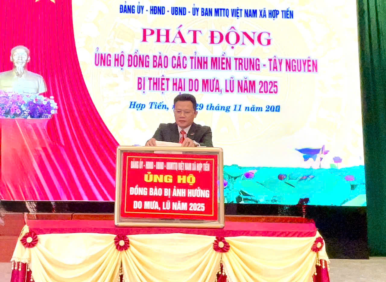 Sáng ngày 29/11/2025, Đảng ủy – HĐND – UBND – Ủy ban MTTQ Việt Nam xã Hợp Tiến tổ chức lễ phát động ủng hộ đồng bào các tỉnh miền Trung và Tây Nguyên khắc phục hậu quả mưa lũ năm 2025. Chương trình nhằm lan tỏa tinh thần đoàn kết, tương thân tương ái, phát huy truyền thống “lá lành đùm lá rách” của dân tộc.