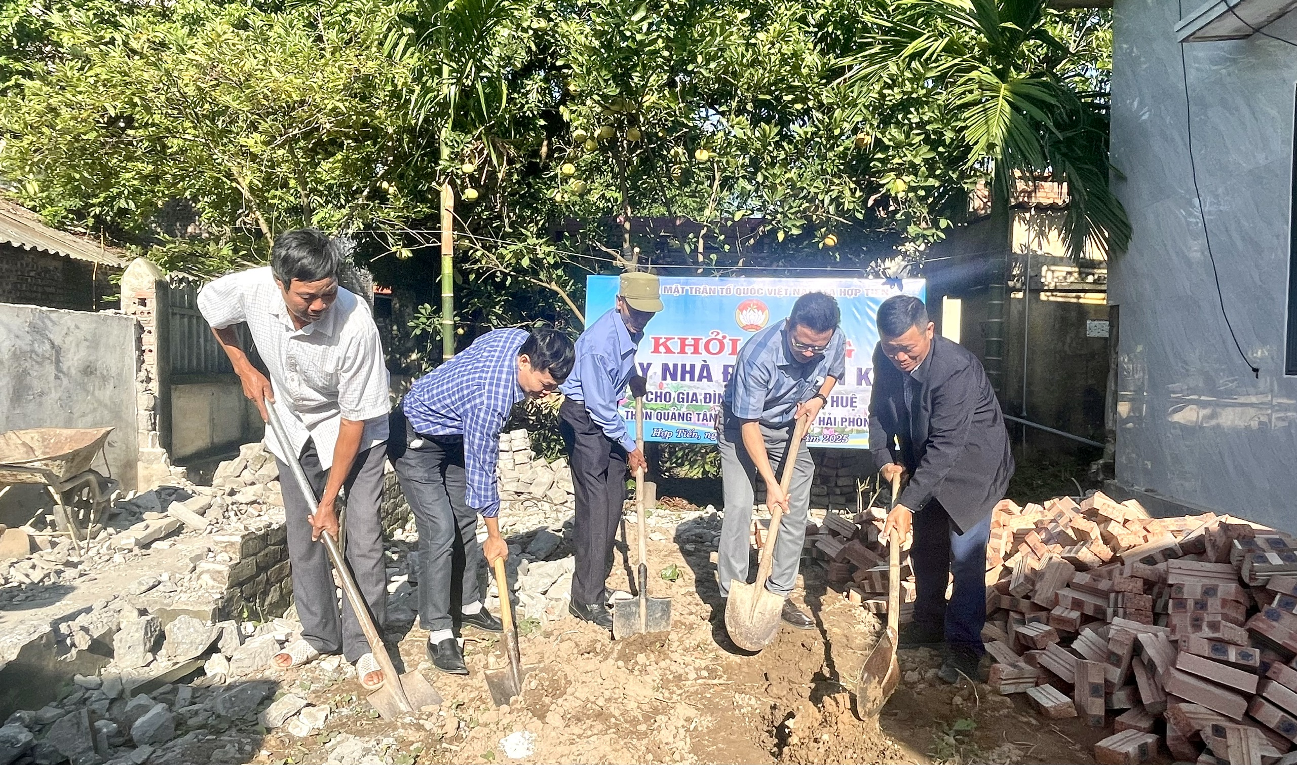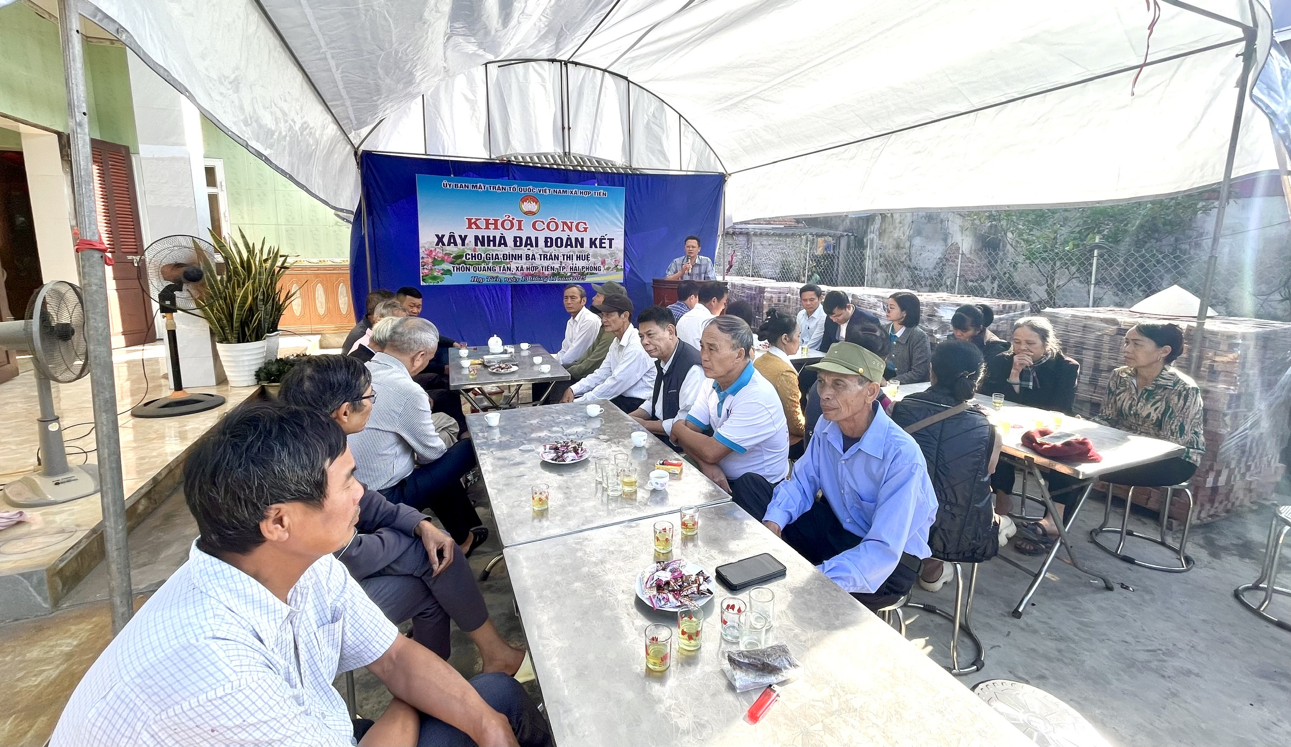 KHỞI CÔNG XÂY DỰNG NHÀ “ĐẠI ĐOÀN KẾT” CHO HỘ BÀ TRẦN THỊ HUỆ Sau khi rà soát và đề nghị của thôn Quảng Tân, Ủy ban MTTQ xã Hợp Tiến đã lập hồ sơ trình Ủy ban MTTQ TP Hải Phòng xem xét hỗ trợ. Qua thẩm định, Ủy ban MTTQ TP Hải Phòng đã quyết định hỗ trợ 100 triệu đồng từ Quỹ “Vì người nghèo” để giúp gia đình xây dựng ngôi nhà kiên cố, ổn định cuộc sống. Ngôi nhà được thiết kế với diện tích 35m², tổng kinh phí dự kiến 125 triệu đồng, trong đó phần còn lại do gia đình, dòng họ và nhân dân thôn Quảng Tân chung tay đóng góp.