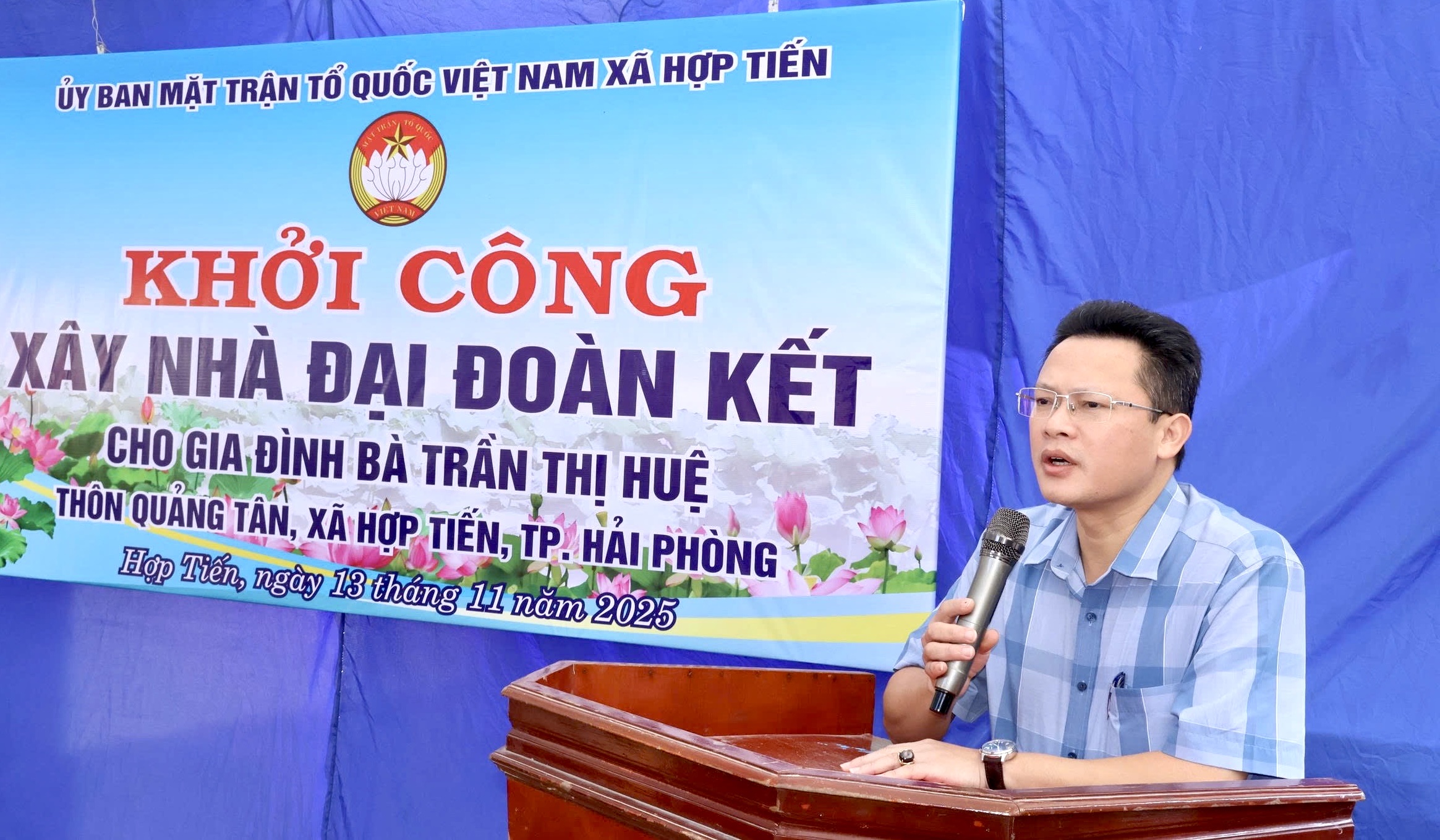 Đồng chí Vũ Xuân Độ - Phó Bí thư Đảng ủy, Chủ tịch UBND xã phát biểuPhát biểu tại buổi lễ, lãnh đạo xã Hợp Tiến bày tỏ mong muốn gia đình bà Trần Thị Huệ sớm hoàn thành ngôi nhà mới, yên tâm ổn định cuộc sống, vươn lên thoát nghèo. Buổi lễ khởi công diễn ra trong không khí trang trọng, ấm áp tình đoàn kết, thể hiện sự quan tâm của các cấp, các ngành và cộng đồng đối với những hộ nghèo, khó khăn trong xã.